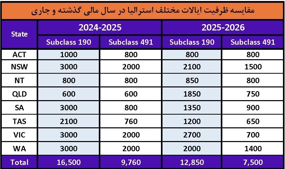 طبق آخرین اخبار منتشر شده ادراه مهاجرت استرالیا در 18 نوامبر 2025 ظرفیت نهایی ایالات استرالیا جهت صدور دعوتنامه های ویزای اسکیل ورکر سابکلاس 190 و 491 مشخص شد.